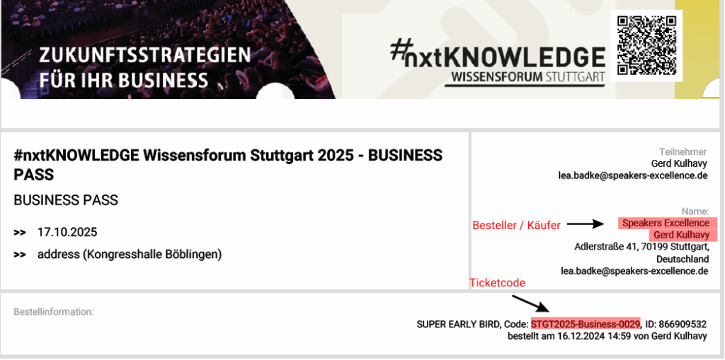 Wichtig: Geben Sie für jeden Teilnehmer den entsprechenden Ticketcode an.