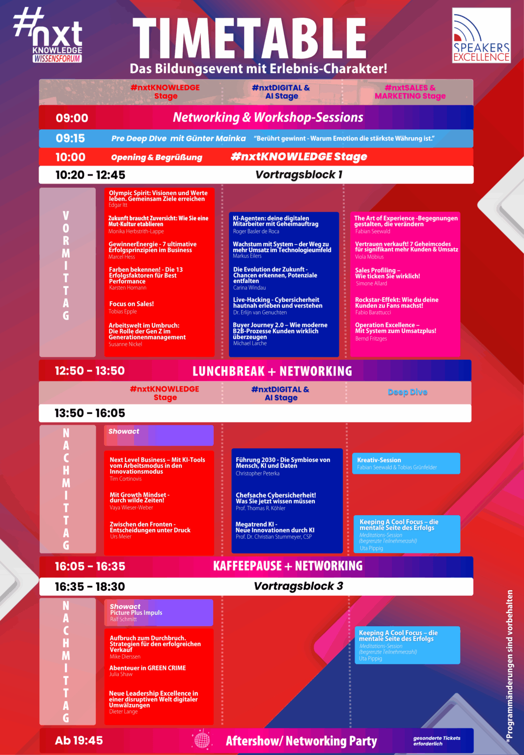 Willkommen beim #nxtKNOWLEDGE Wissensforum Stuttgart – Ihrem Hotspot für innovatives Denken, progressive Ideen und inspirierende Begegnungen! Erleben Sie live, wie über 30 führende Köpfe aus Wirtschaft, Marketing, Führung, Verkauf, Gesundheit und Sport ihre neuesten Erkenntnisse mit Ihnen teilen. Nutzen Sie diese einzigartige Gelegenheit, um neue Impulse zu sammeln, wertvolle Kontakte zu knüpfen und Ihr Netzwerk gezielt zu erweitern. Lassen Sie sich inspirieren, bauen Sie nachhaltige Geschäftsbeziehungen auf und bringen Sie Ihr Unternehmen auf das nächste Erfolgslevel!